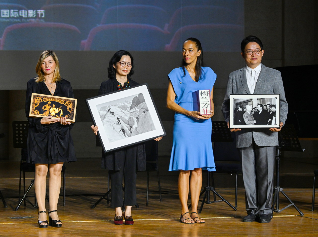 音乐会的互赠环节,寓意中法电影携手同行的百年,共同迎接更加美好的未来。查理·卓别林的孙女卡门·卓别林将一幅珍藏多年的卓别林与梅兰芳合影赠予梅兰芳先生曾孙、梅兰芳纪念馆研究员梅玮。梅玮则回赠书籍《梅兰芳菲》。中国电影资料馆副馆长张旭霞与法国奥弗涅-罗讷-阿尔卑斯大区副主席苏菲·洛特科夫同样互赠珍贵电影礼物,寓意中法电影文化圆满合作、历久弥新。