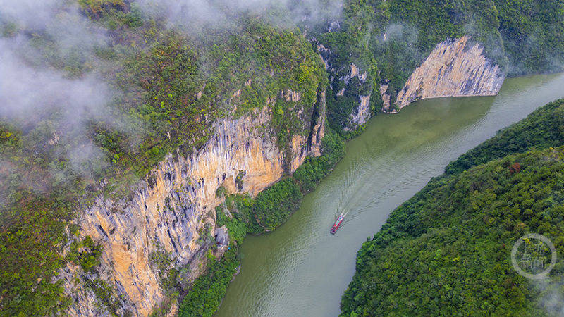 “空山新雨洗尘烟,云裁巫山十二鬟。一舟划破琉璃境,人在江心画里看。”秋雨初歇,巫山云雨如轻纱漫卷,将小三峡笼罩在朦胧诗意之中。鱼头湾的一湾碧水静卧在层叠山峦间,赭石崖壁与斑斓林木与一江碧水相映,宛如一幅流动的丹青。